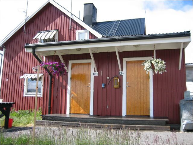 Servicehuset ligger i samma byggnad som kiosken och receptionen Här finns dusch och toalett på bekvämt avstånd.